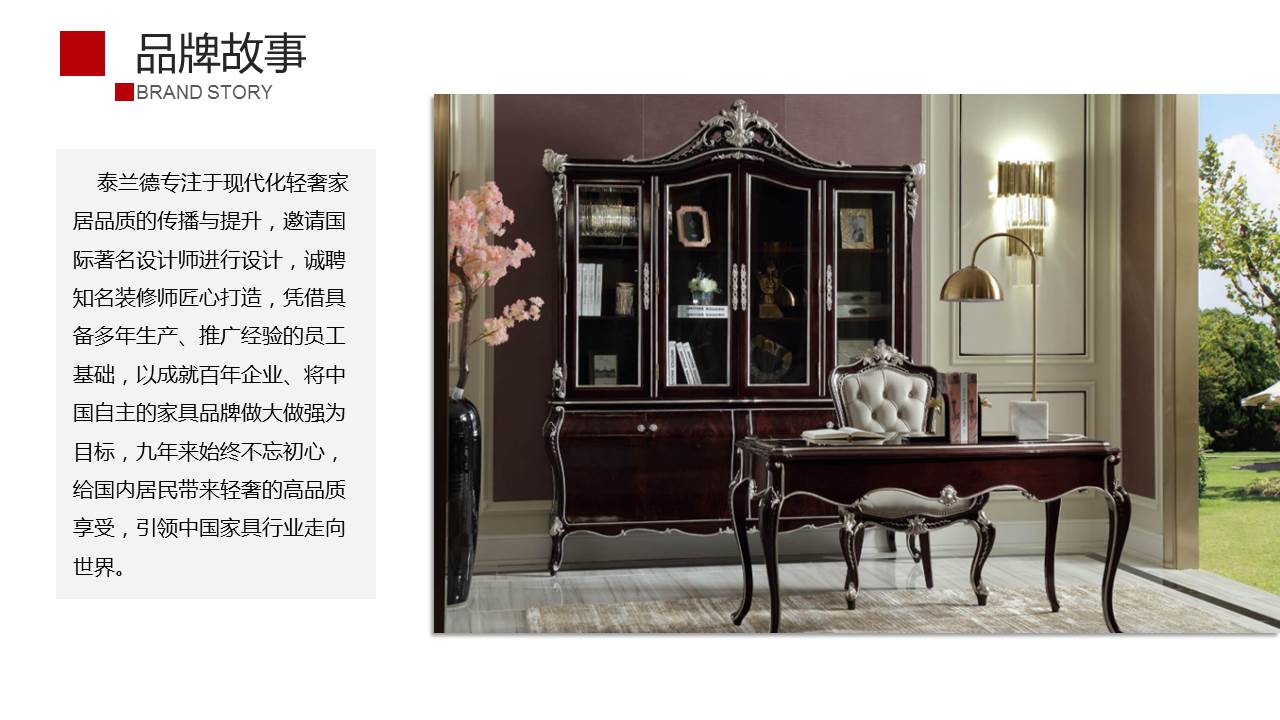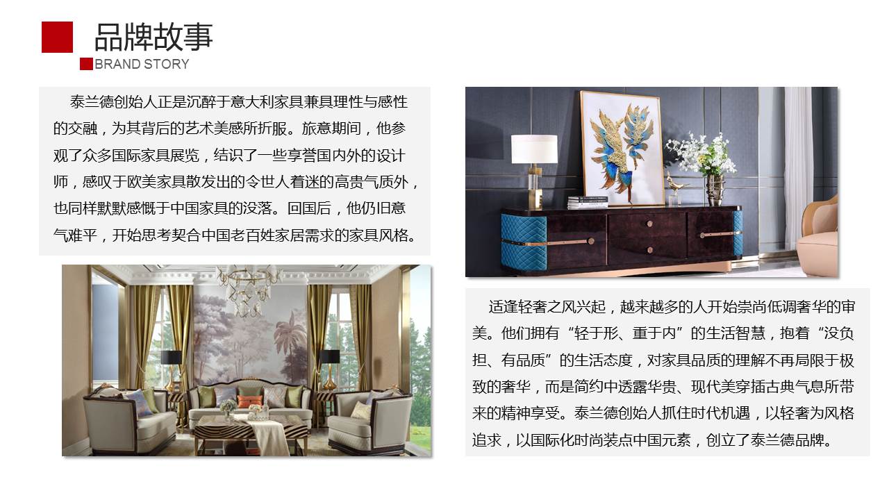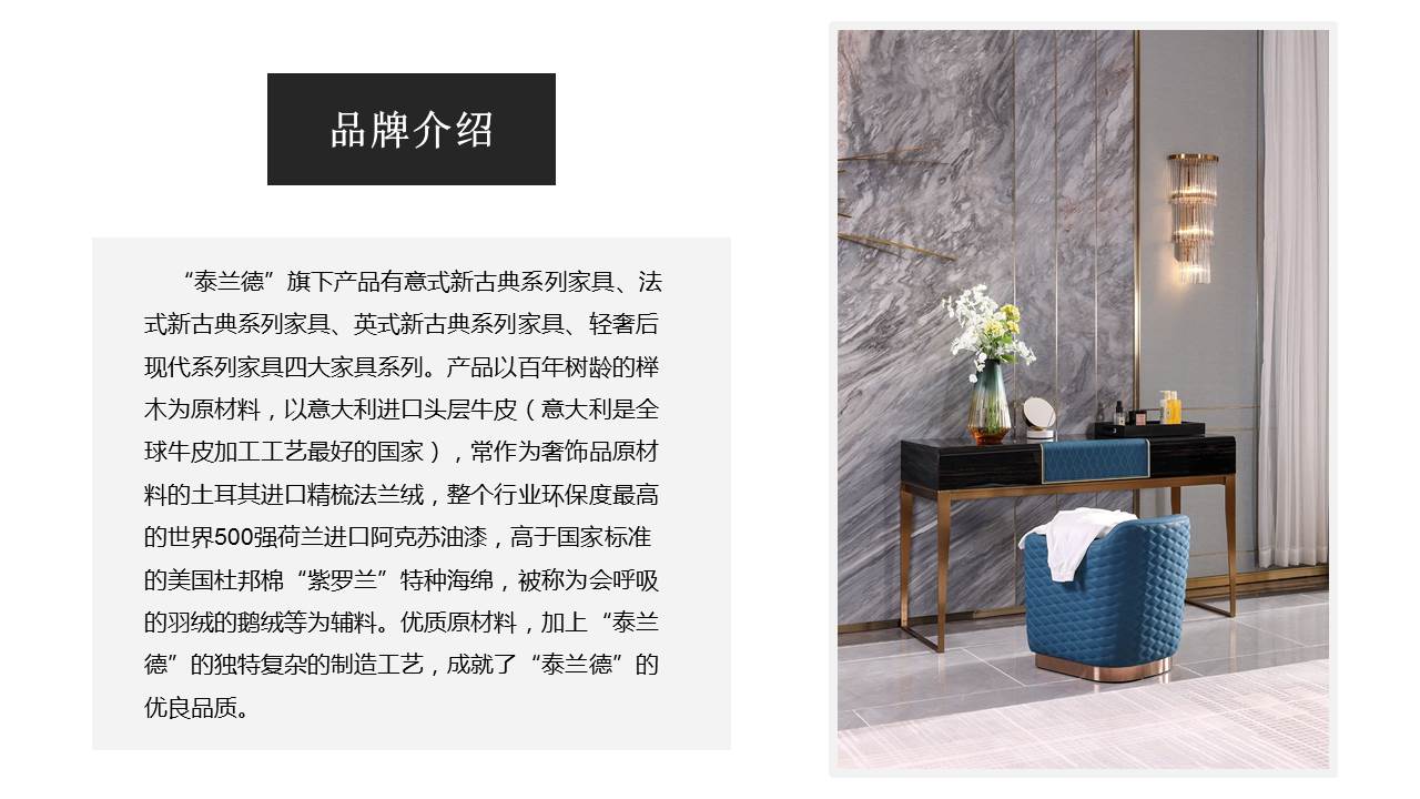 “泰兰德”旗下产品有意式新古典系列家具、法式新古典系列家具、英式新古典系列家具、轻奢后现代系列家具四大家具系列。产品以百年树龄的榉木为原材料,以意大利进口头层牛皮(意大利是全球牛皮加工工艺最好的国家),常作为奢饰品原材料的土耳其进口精梳法兰绒,整个行业环保度最高的世界500强荷兰进口阿克苏油漆,高于国家标准的美国杜邦棉“紫罗兰”特种海绵,被称为会呼吸的羽绒的鹅绒等为辅料。优质原材料,加上“泰兰德”的独特复杂的制造工艺,成就了“泰兰德”的优良品质。